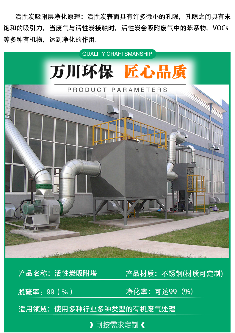 活性炭吸附裝置整體可采用PP、不銹鋼、鐵等材料制成,采用抽屜式的加炭方式,操作方便,占地面積小,安裝好即可使用,無需人工看管,做好清洗與換炭工作即可。