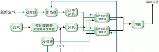 活性炭吸附--脫附凈化裝置根據吸附和催化燃燒兩個基本原理設計,采用雙氣路連續工作,一個催化燃燒室,多個吸附床交替使用。