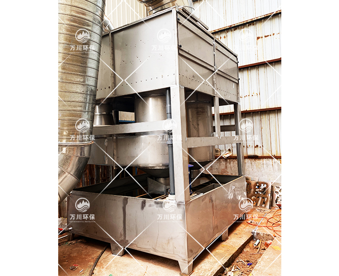 噴淋塔是一種效率高、壓力損失較低的除塵設備。廢氣正面切向進入至內部的噴淋層,通過水洗、噴淋、過濾后漆霧(在循環水中加入漆霧絮凝劑,使得油性漆霧在水中的溶解性更大)。