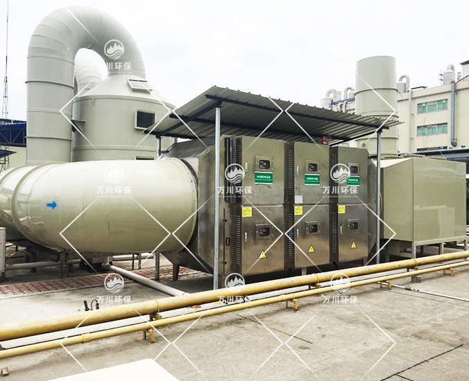 博敏公司有三間廠房,每間廠房均設有生產線,字符、阻焊工序產生的揮發性的廢氣通過管道已接駁到樓頂,經過原有噴淋塔洗滌后排放。但是這種方法只能清除少量的廢氣,并不能達到環保法律法規的要求。所以委托我們萬川環保定制了三套“除霧器+UV光氧凈化器+活性炭吸附裝置”。